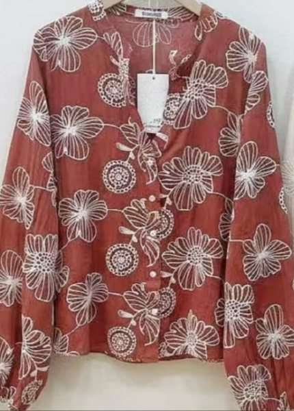 blusa confeccionada en tejido de poliamida con algodón, cuello tipo mao, bordados a color en el tono natural y a contracolor en el tono caldera, puños con elástico, diseñada en España.